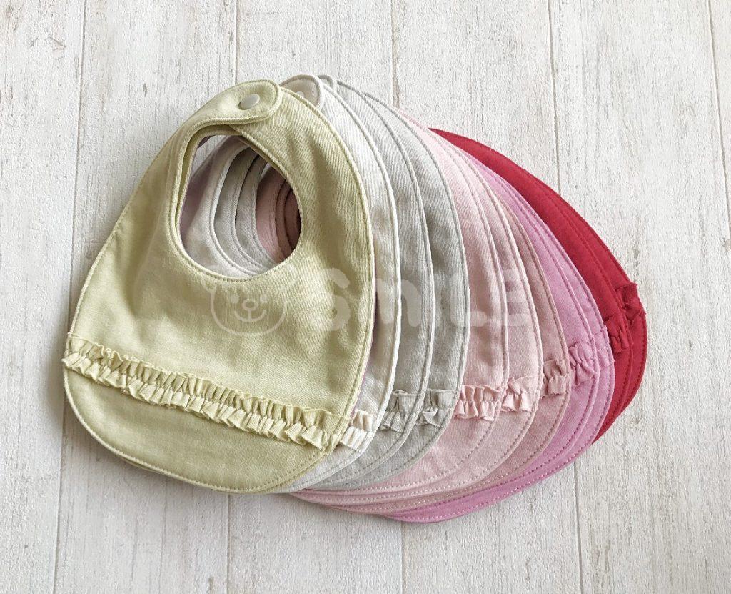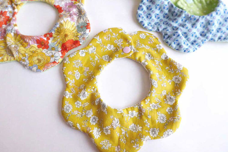 エプロンのように首から下げるものや、昔話の金太郎のような前掛け風、食べこぼし用のポケットがついたシリコン製品などさまざまなデザインが見られますが、今回は、お花のようなデザインがかわいい、付け襟風のベビースタイの作り方をご紹介します。